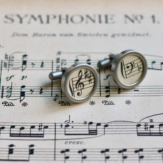 Schmuckstücke für Musikliebhaber mit Motiven aus historischen Notenblättern und Notenheften.