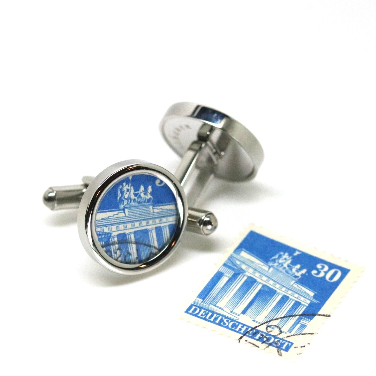 Manschettenknöpfe mit Ausschnitt einer original Briefmarke mit Brandenburger Tor in Blau.Ein Paar Manschettenknöpfe aus hochglänzend poliertem Edelstahl mit Ausschnitten aus original Briefmarken. Die Manschettenknöpfe haben einen Durchmesser von 18 mm.