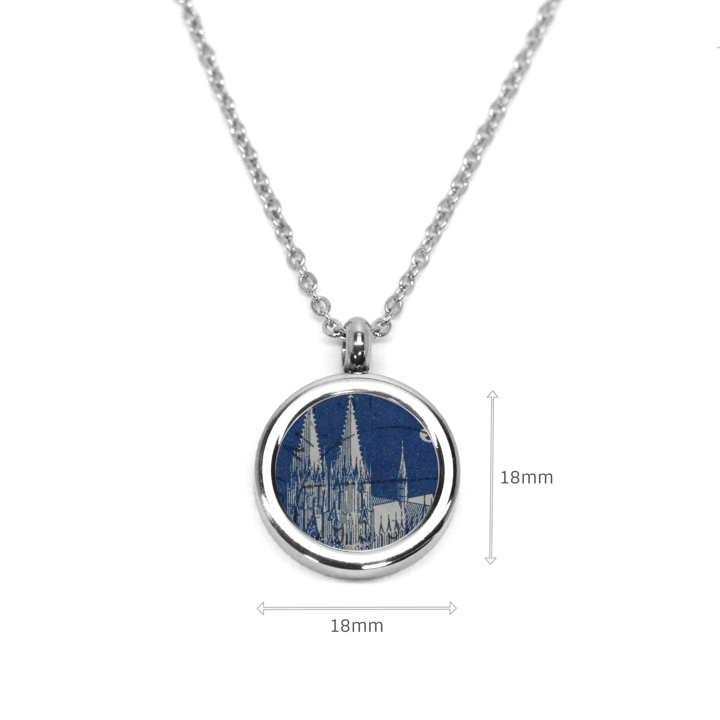 Medaillonkette aus hochglänzend poliertem Edelstahl mit dem Kölner Dom in Blau. Das Medaillon hat einen Durchmesser von 18 mm. Ein besonderes Geschenk für Köln-Liebhaber.