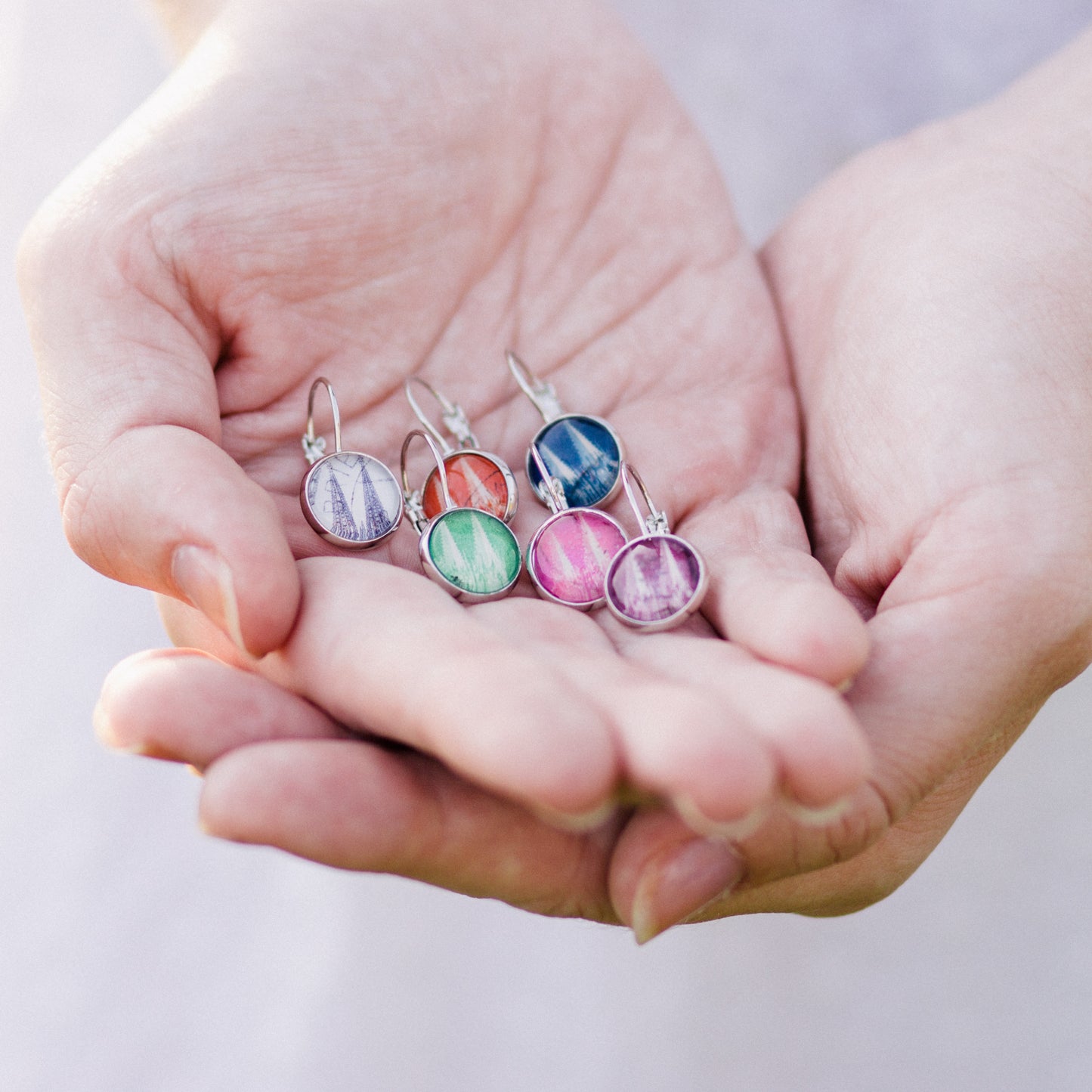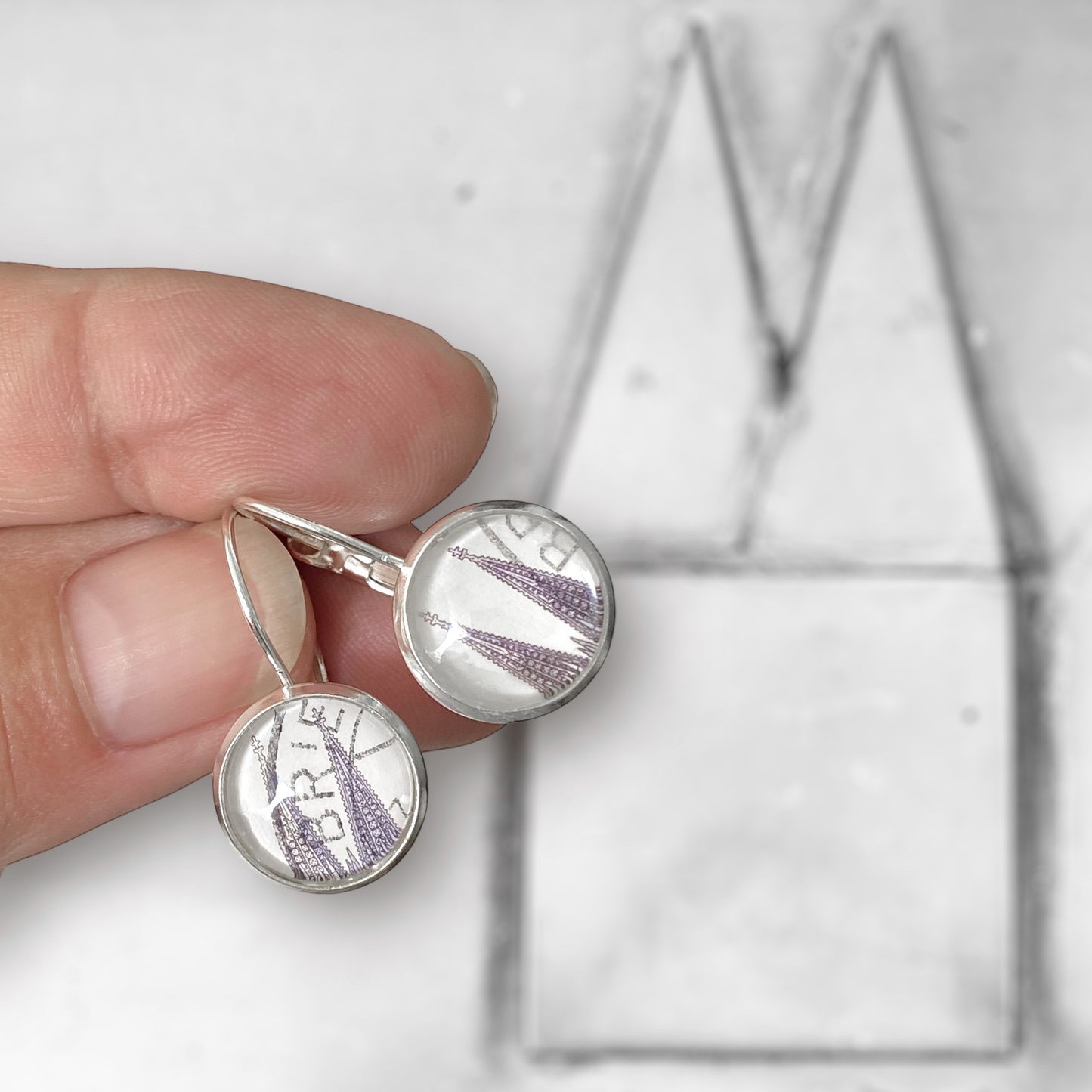 Kleine Ohrhänger mit den Kölner Domspitzen in verschiedenen Farben. Hergestellt aus original Briefmarken. Die Ohrhänger haben einen Durchmesser von 12 mm. Brisurenverschluß.