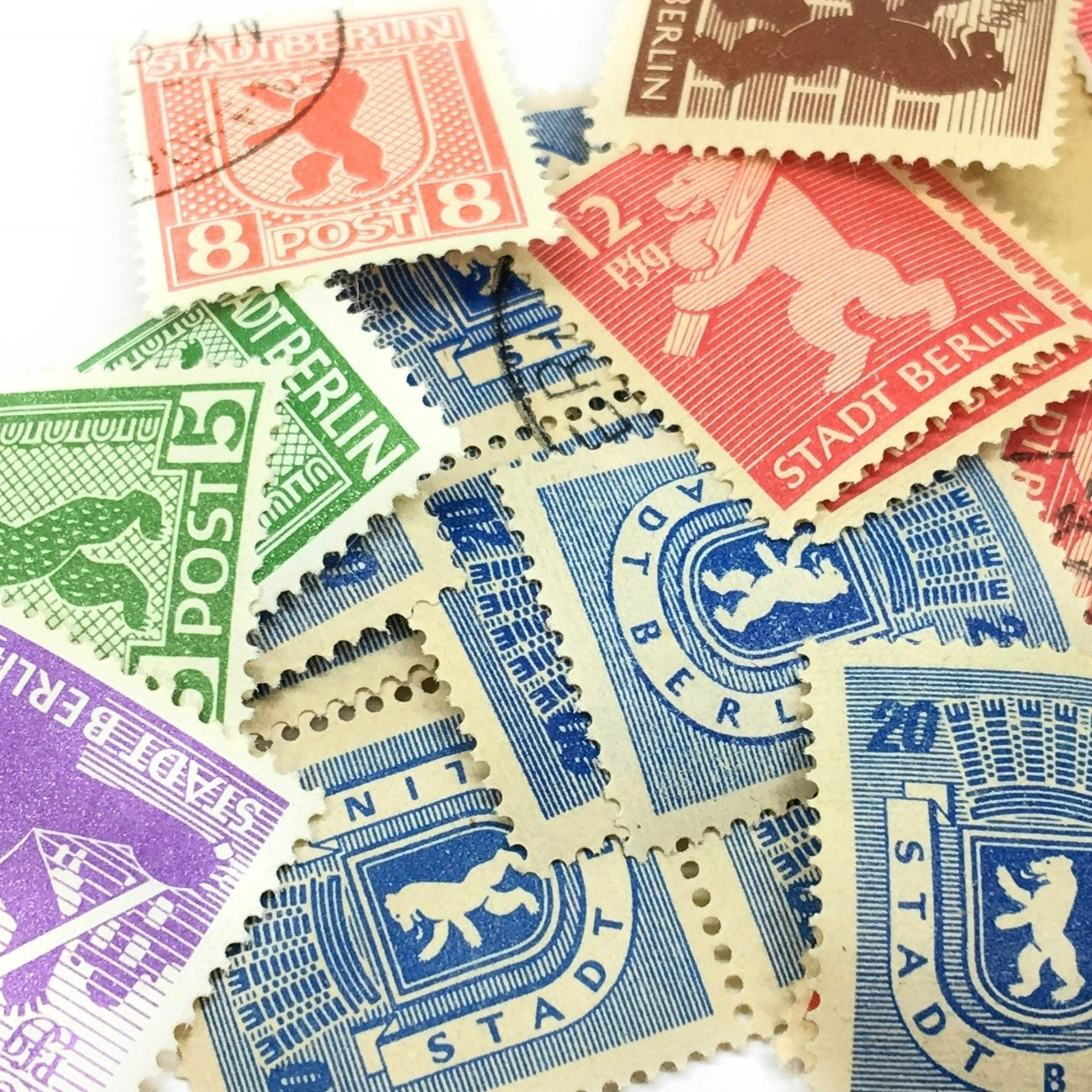 Medaillon aus poliertem Edelstahl mit original Briefmarken "Stadt Berlin" von 1945. Der Anhänger hat einen Durchmesser von 18 mm. Die Rolokette hat eine verstellbare Länge von 50/40 cm.