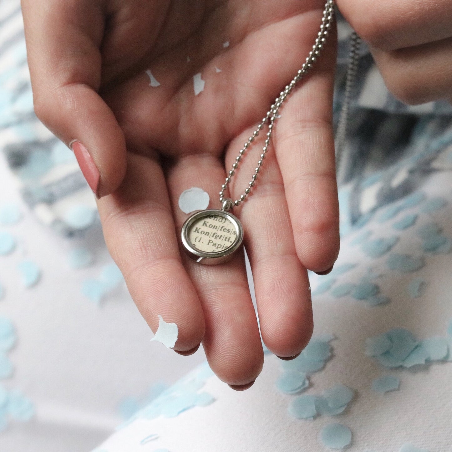 Kleine Medaillonkette mit persönlichem Wort aus historischem Papier