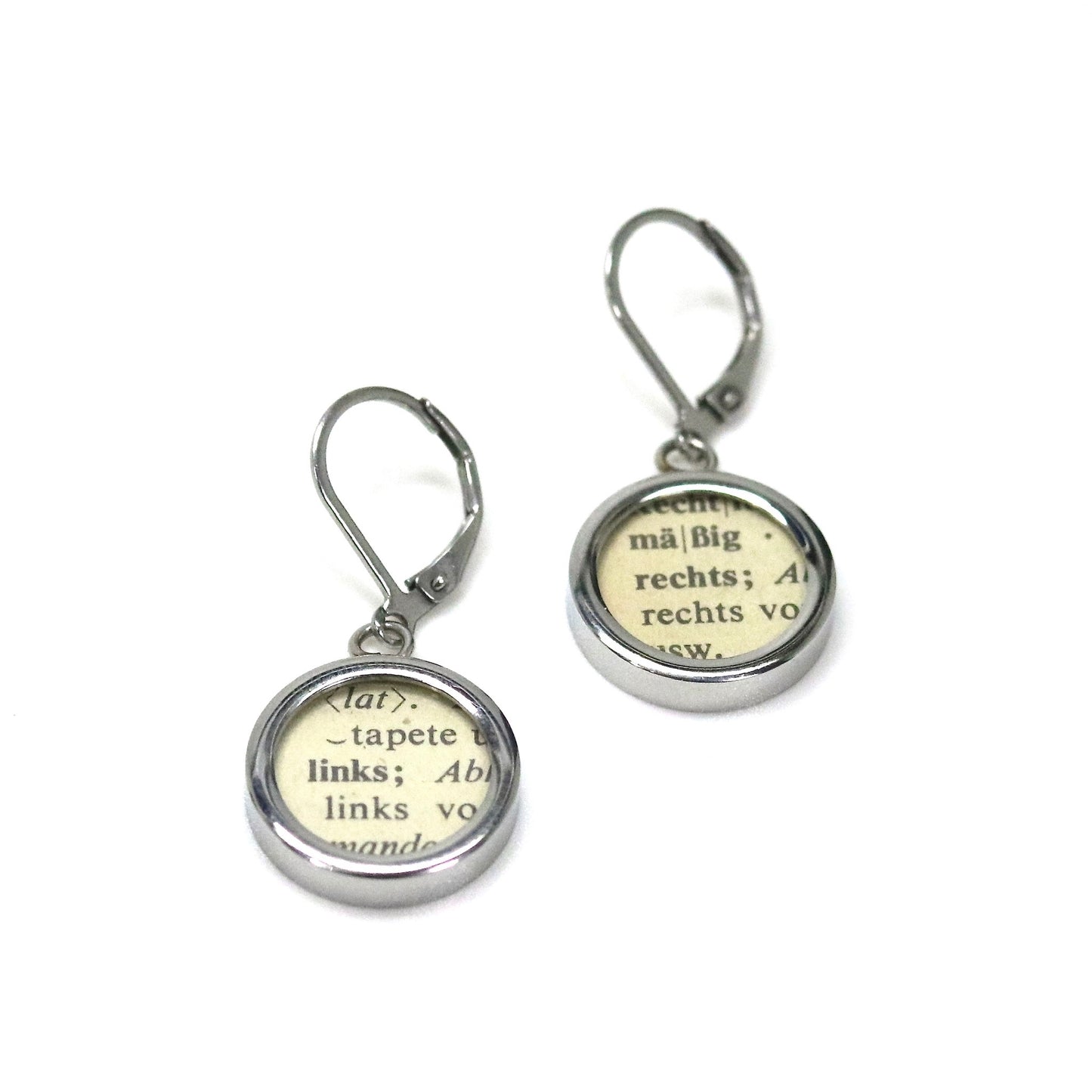 Ein Paar Ohrhänger aus Edelstahl mit Ausschnitten aus historischen Wörterbüchern aus den 1950er Jahren. Die Ohrhänger haben einen Durchmesser von 16 mm.
