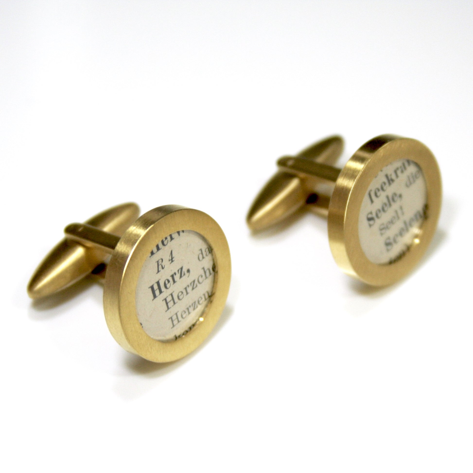 Deine Worte nach Wahl. Manschettenknöpfe aus mattem vergoldetem Edelstahl mit Deinen Wörtern aus historischen Wörterbüchern aus den 1950-1980er Jahren. 18 mm Durchmesser.