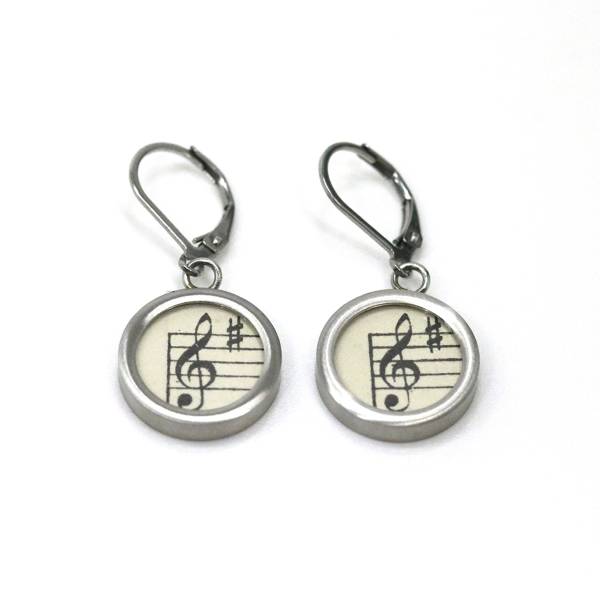 Ohrhänger aus hochglänzendem oder mattem Edelstahl. Mit Ausschnitten aus historischen Notenblättern. 16mm Durchmesser.