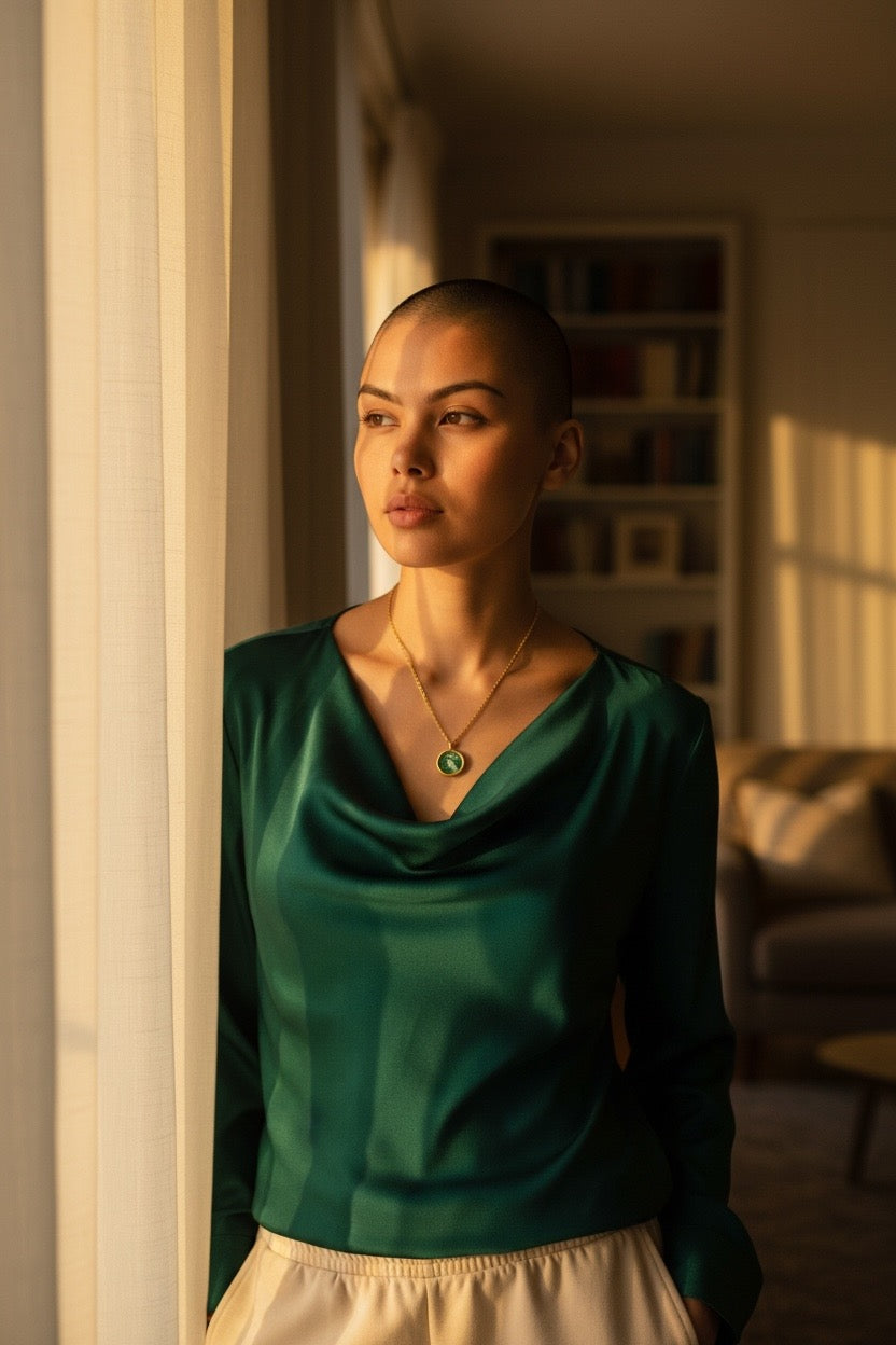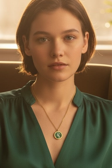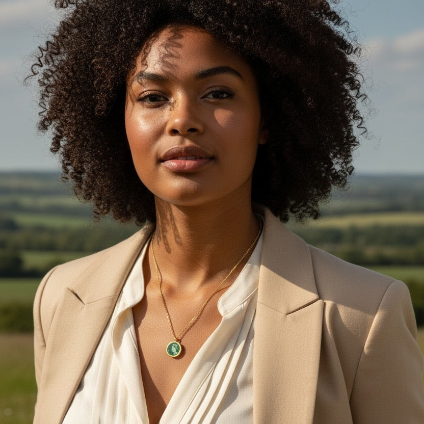 Kleine Medaillonkette mit Queen Elizabeth Briefmarke Grün im Typewriter Gold Design